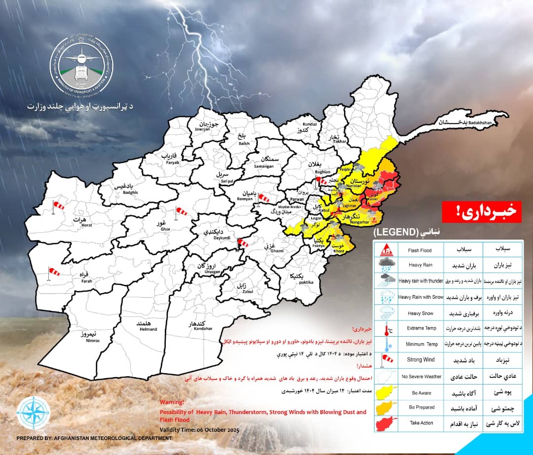 ریاست هواشناسی وزارت ترانسپورت و هوانوردی گروه طاـلبان از احتمال بارش باران، سرازیر شدن سیلاب