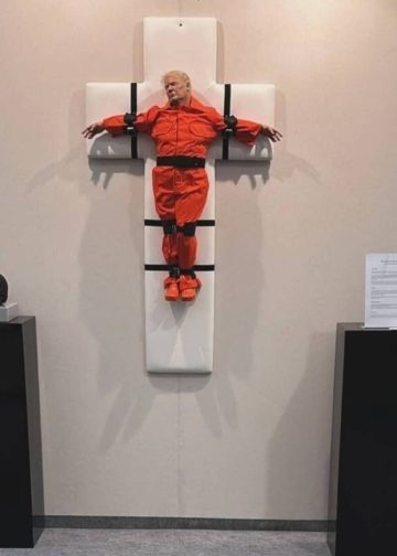 آرزو پرنیان مجسمهی ترامپ در لباس زندانی نارنجی و بر صلیبی سفید، با عنوان "قدیس یا گناهکار"، در مسیر هنری ...