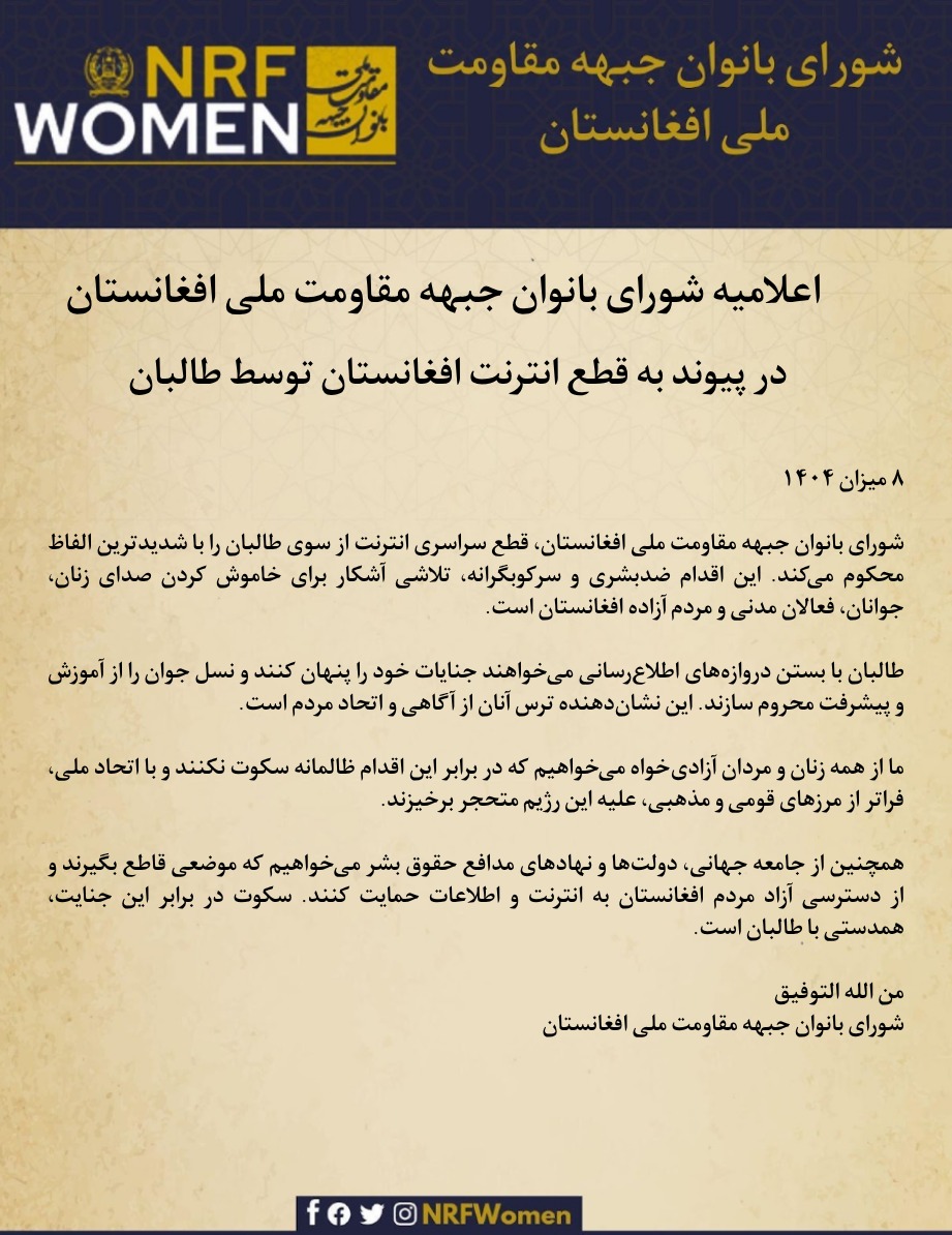شورای بانوان جبهه مقاومت ملی خراسانافغانستان، در واکنش به قطع انترنت در سراسر کشور توسط گروه طاـ لبان روز سهشنبه (۸ میزان/مهر) طی اعلامیهای این اقدام گروه طاـ لبان را ضدبشری و سرکوبگرانه، تلاشی برای خاموش کردن زنان خواند.