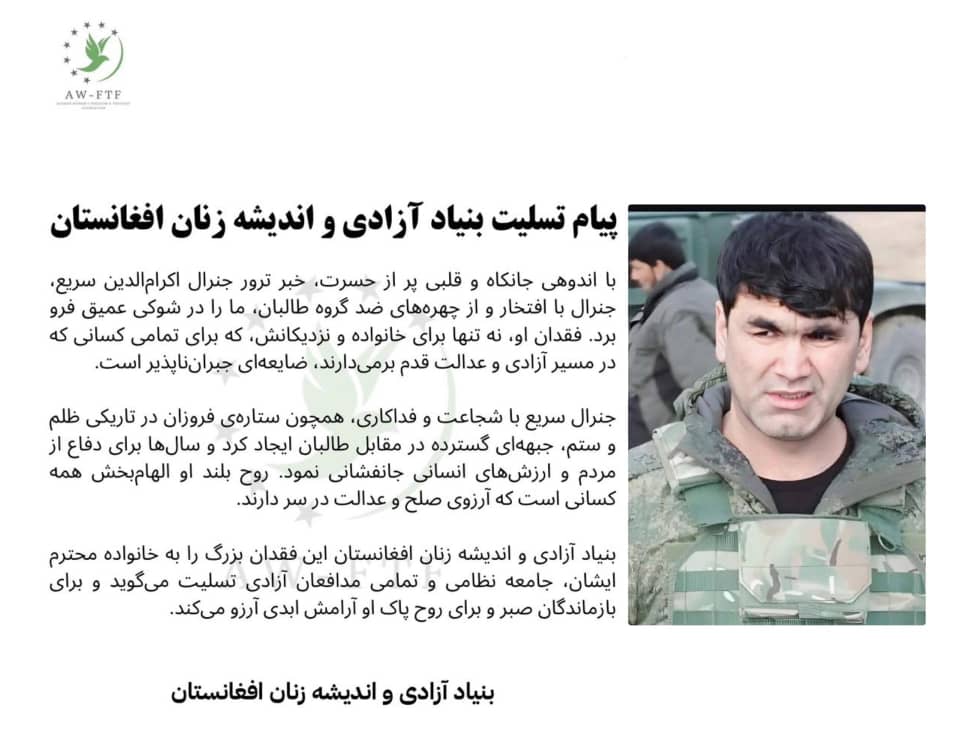 بنیاد آزادی و اندیشه زنان خراسانافغانستان با نشر اعلامیهای روز پنجشنبه (۴ جدی/دی) ترور ارتشبد اکرامالدین سریع، از چهرههای برجسته و ضد گروه طالبان را به شدت محکوم کرد و این رویداد را ضایعهای جبرانناپذیر خواند.