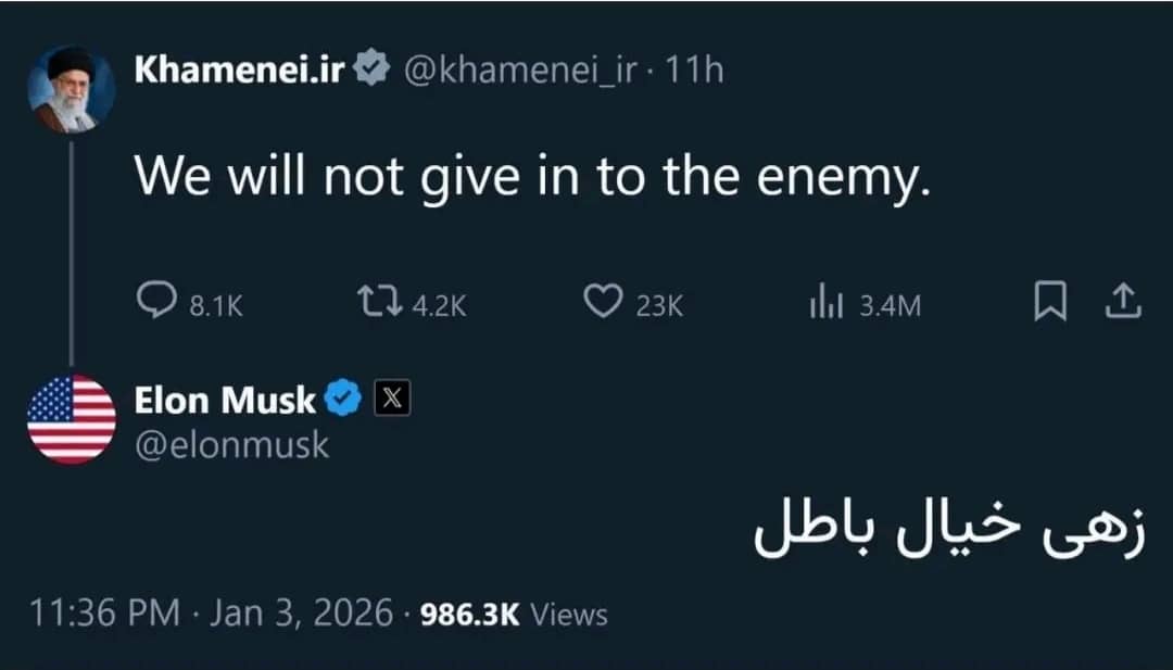ماسک در پاسخی کوتاه اما قابل توجه، به زبان فارسی نوشت: «زهی خیال باطل»، که نشاندهنده واکنش مستقیم به پست رهبر ایران بود.