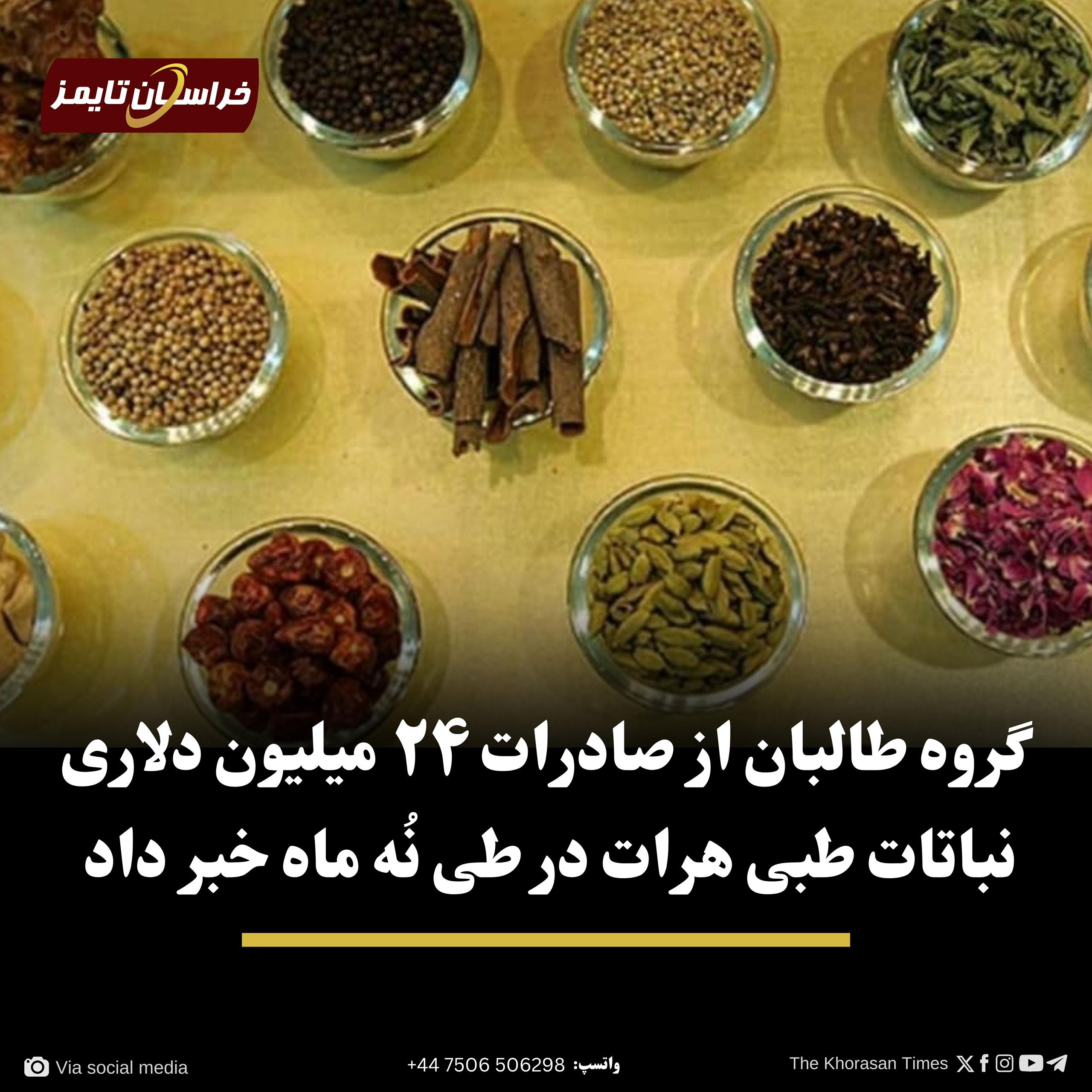 مقام های محلی گروه طالبان در هرات اعلام کردهاند که طی نُه ماه گذشته، نباتات طبی این استان به ارزش ۲۴ میلیون و ۲۶۸ هزار دالر به کشورهای امریکا، روسیه، ایران و امارات متحده عربی صادر شدهاست.