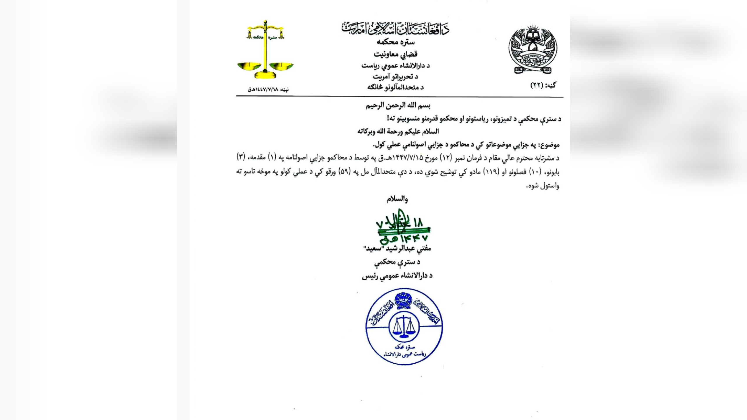 به گفتهی این نهاد، سند یادشده روز چهارشنبه، ۱ دلو/بهمن، منتشر شده و در سه باب، ۱۰ فصل و ۱۱۹ ماده تنظیم و توسط هبتالله آخندزاده، رهبر گروه طالبان، توشیح شدهاست.