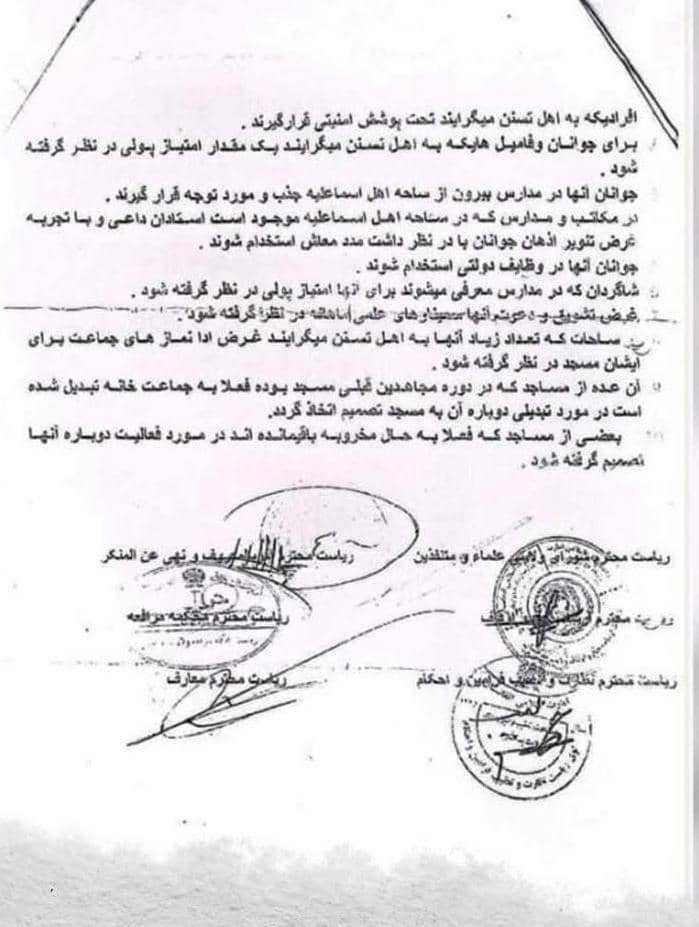 به تازگی یک سند داخلی گروه طالبان که در استان بدخشان توزیع شده، جزییات یک برنامه سازمانیافته برای فشار آوردن به پیروان مذهب اسماعیلیه به منظور تغییر مذهب و گرایش به مذهب اهل سنت را فاش کردهاست.