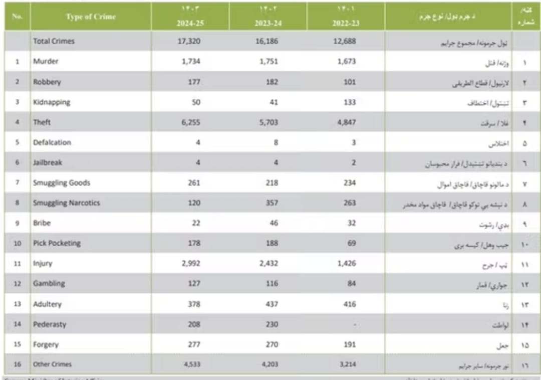 اسناد داخلی اداره احصائیه و معلومات گروه طالبان نشان میدهد شمار جرایم جنایی ثبتشده از ۱۰,۸۳۴ مورد در سال ۱۴۰۰ به ۱۷,۳۲۰ مورد در سال ۱۴۰۳ رسیده که افزایشی حدود ۶۰ درصدی را نشان میدهد.