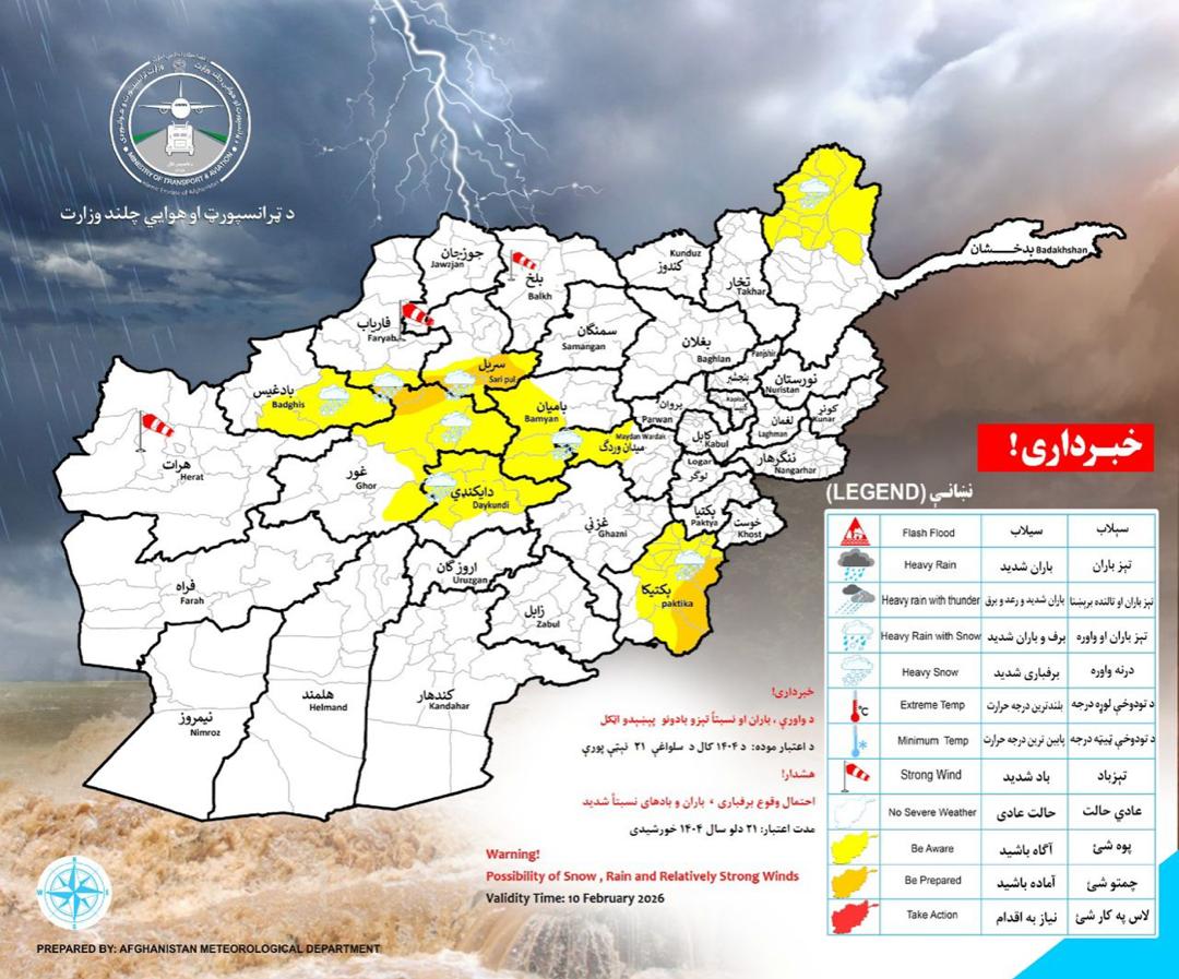 اعلامیه اداره هواشناسی این گروه، از احتمال بارش برفوباران در اُستانهای بادغیس، فاریاب، سرپل، غور، بامیان، دایکندی، میدان وردک، پکتیکا و بدخشان خبر دادهاست.