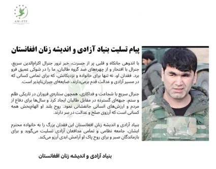 آرزو پرنیان بنیاد آزادی و اندیشه زنان خراسانافغانستان با نشر اعلامیهای روز پنجشنبه (۴ جدی/دی) ترور ارتشبد اکرامالدین سریع، از چهرههای برجسته و ضد گروه
