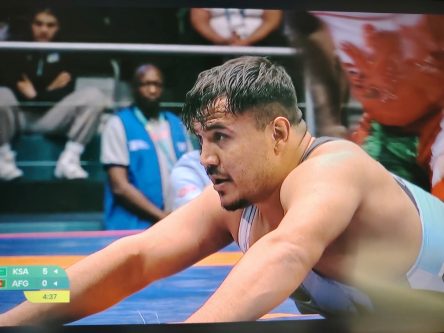 شیلا« احمدی» سیدجواد اصغری، کشتیگیر خراسانافغانستان در وزن ۹۷ کیلوگرم سبک جورج-رومن، همراه با حریف عربستانیاش در ششمین دور رقابتهای همبستگی کشورهای اسلامی ۲۰۲۵، به